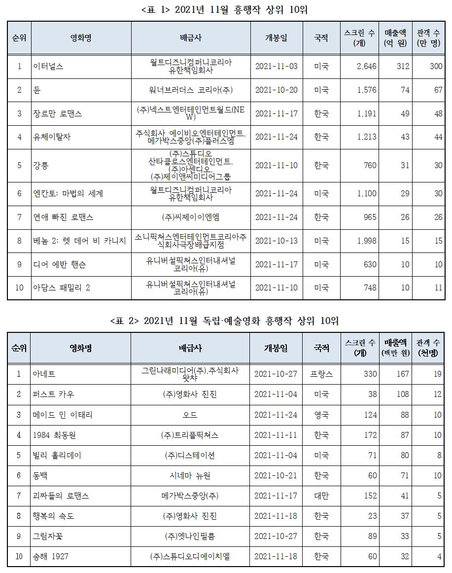 마동석 배우의 할리우드 진출작 <이터널스>가 312억 원(관객 수 300만 명)의 매출로 11월 전체 흥행 1위에 올랐다. <듄>이 74억 원(관객 수 67만 명)의 매출로 전체 흥행 2위였고, 154억 원(누적 관객 수 143만 명)의 누적 매출을 기록했다. 추석 연휴가 지난 이후 한국영화의 개봉이 뜸했으나, 11월 영화관 입장료 할인권 지원사업으로 11월 한국영화의 개봉이 늘었다. 2021년 11월 한국영화 실질 개봉 편수는 25편으로 올해 최고치를 기록했다. 그 결과 흥행작 상위 10위에 한국영화 4편이 오르면서 지난 10월 2편이었던 것보다 증가했다. 한국영화로는 <장르만 로맨스>가 49억 원(관객 수 48만 명)으로 전체 순위 3위를 차지한 것이 최고 기록이었다. <유체이탈자>가 43억 원(관객 수 44만 명)으로 4위였고, <강릉>이 31억 원(관객 수 30만 명)으로 5위였다. <연애 빠진 로맨스>는 26억 원(관객 수 26만 명)의 매출로 7위에 자리했다. 코미디, 액션, 범죄, 코믹 멜로 등 다양한 장르의 한국영화가 11월 개봉해 극장가를 풍성케 했다.