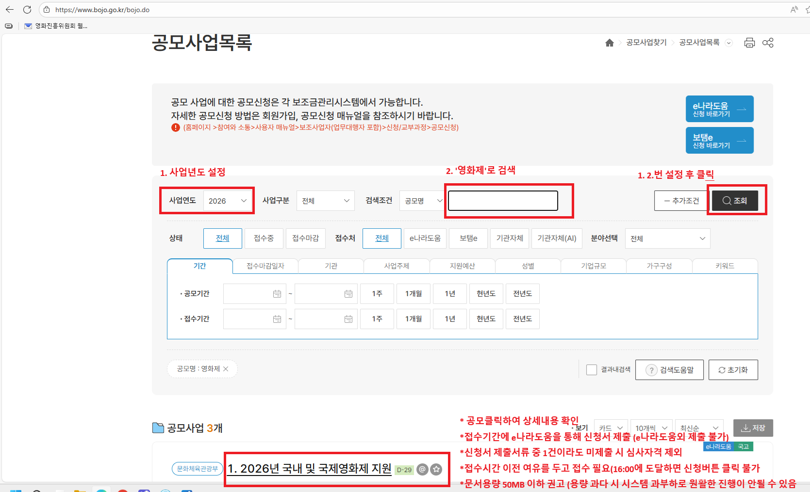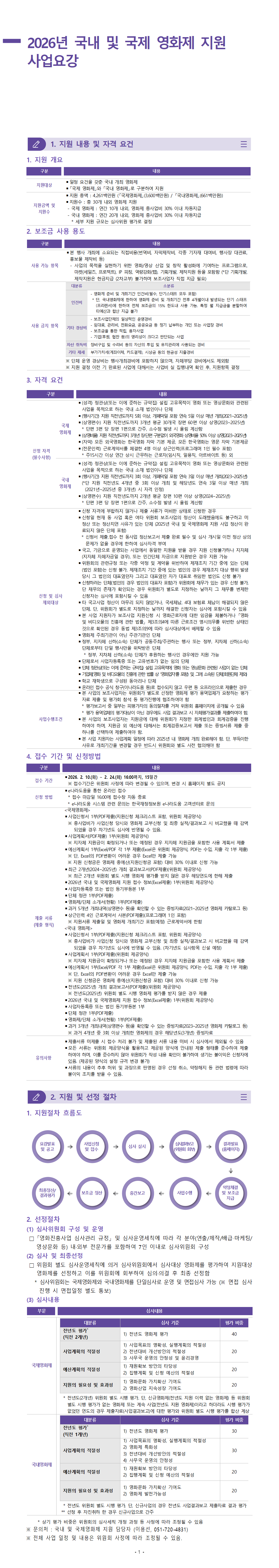 ★ 사업설명회 안내ㅇ 일시: 2026. 2. 5.(목) 14:00~16:00 ㅇ 참여방법: 온라인 줌(zoom)ㅇ 온라인 참여링크 (https://us06web.zoom.us/j/7395624811?pwd=RX4e0g0fRQibOKrQ4yzME3LQZvqYl0.1&omn=87058681004)ㅇ 회의 ID: 739 562 4811 / 암호: 2025 ㅇ 설명회 주요내용 - 2026년 국내 및 국제영화제 지원 사업 지원 개요 - 전년 대비 변경사항 - 사업신청 유의사항 안내 등ㅇ 문의: 영화문화팀 이용선(T.051-720-4831) * 별도 영화진흥위원회 홈페이지 공지 예정